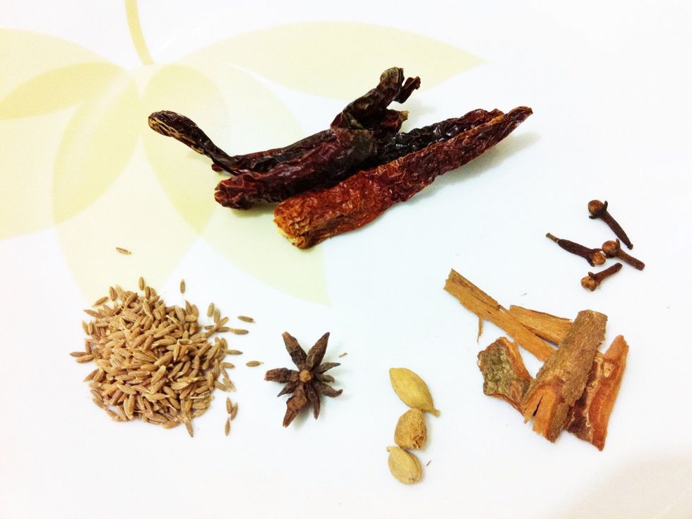 Add 5 cloves, 4 cardamoms, 3 sticks of cinnamon, 1 tablespoon of peppercorns and 2 tablespoons of cumin into a grinder and grind it to a fine powder. (This will be part of the wet paste soon)