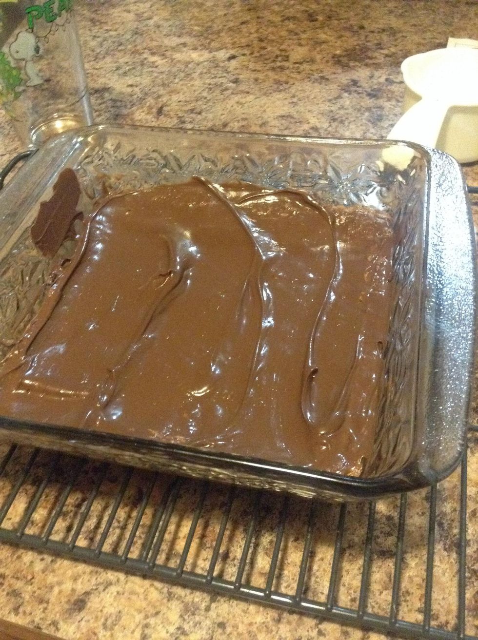 Take out when golden brown!! Then add chocolate chips wait until they melt on top ten spread around.