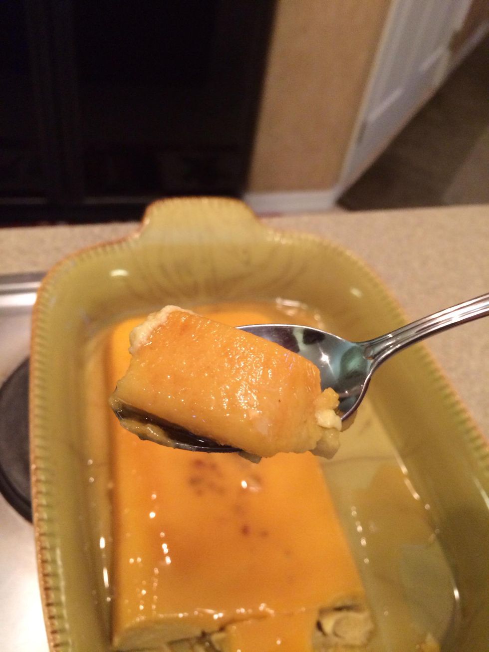 Now that the sugar has hardened and cooled slightly, pour the custard into the bread pans.