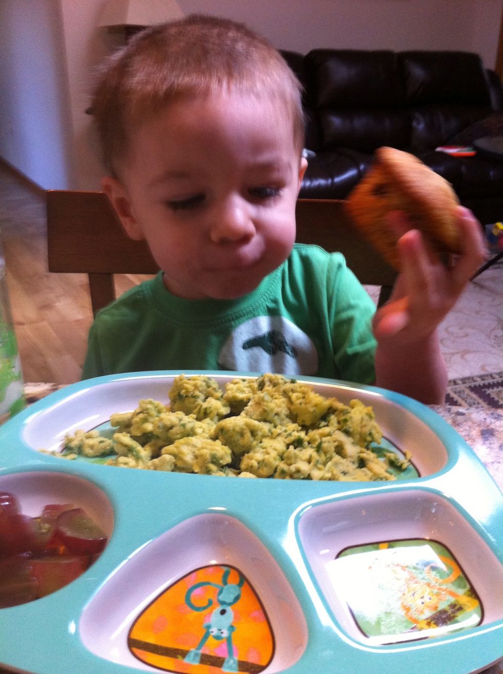 Whip eggs, milk and kale or spinach in a blender until well blended. Spray the pan with cooking spray and add eggs. Cook stirring frequently until eggs start to set - about 4 to 5 minutes.