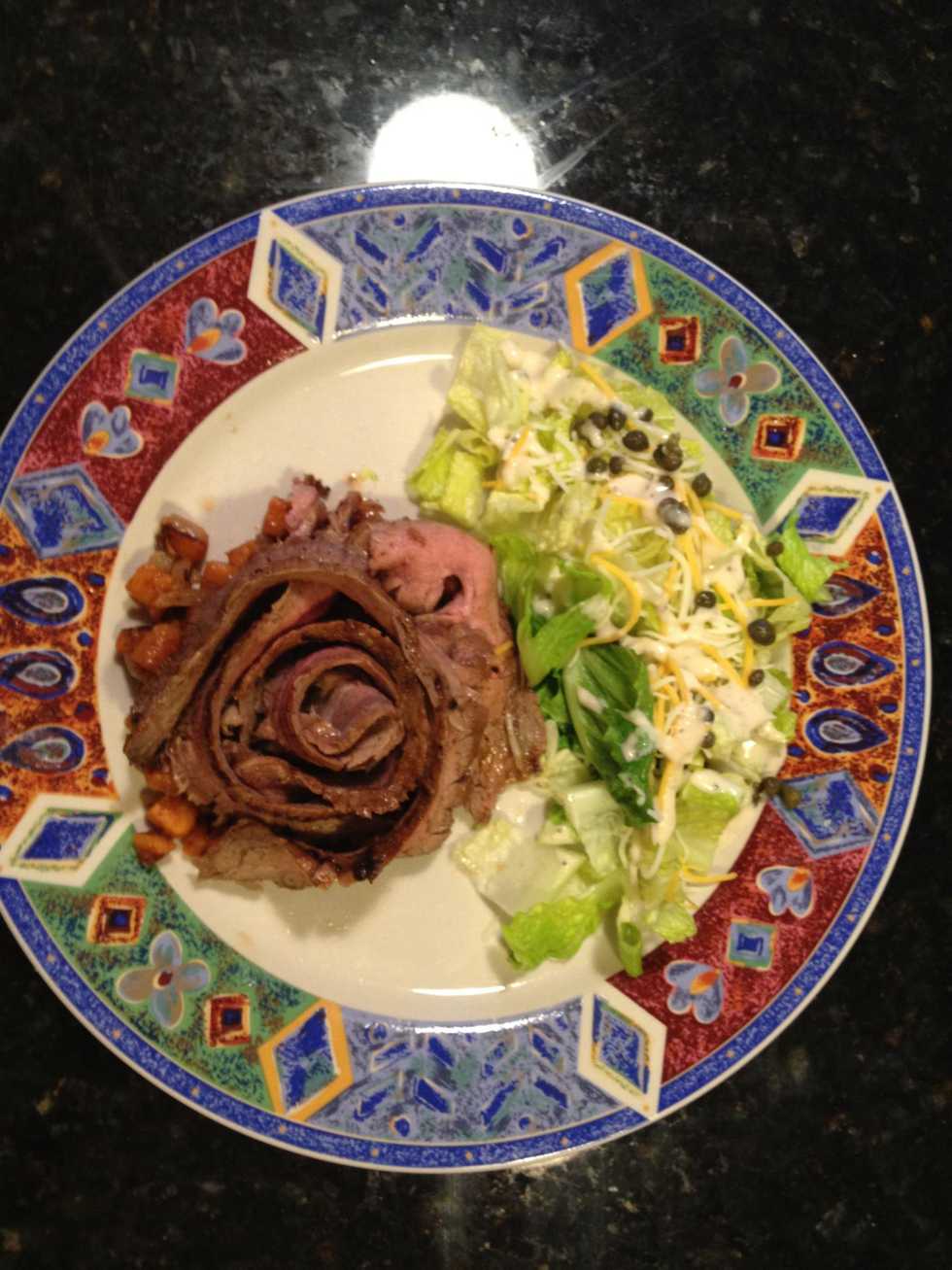 Sliced the steak on the bias and place on top of the potatoes. Served with a green salad and you got a meal fit for a king