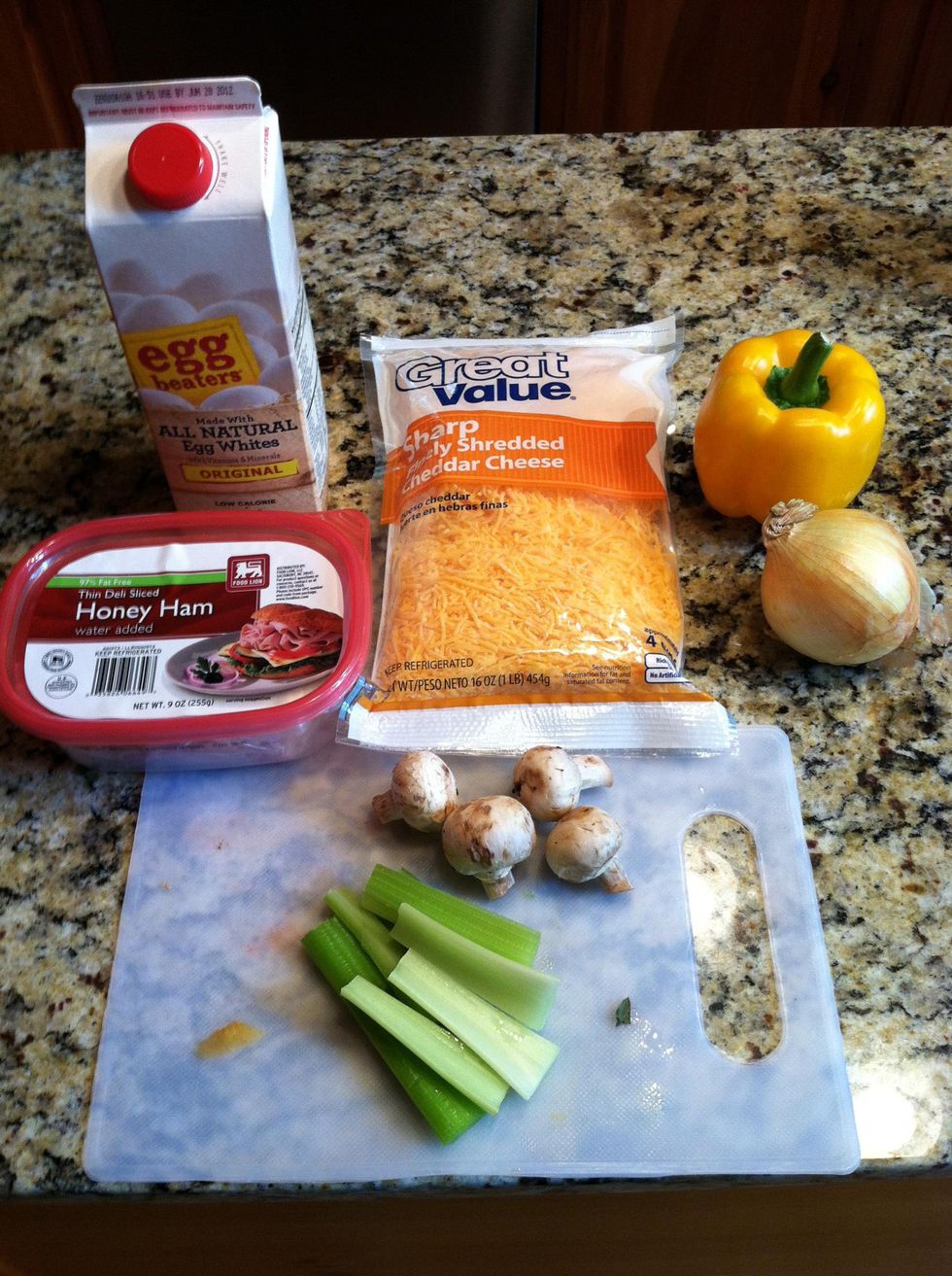1/6 Onion chopped1/4 Yellow pepper1.0 Celery sticks4.0 Slices ham2.0c Egg whites1/3c Cheese4.0 Mushroom
