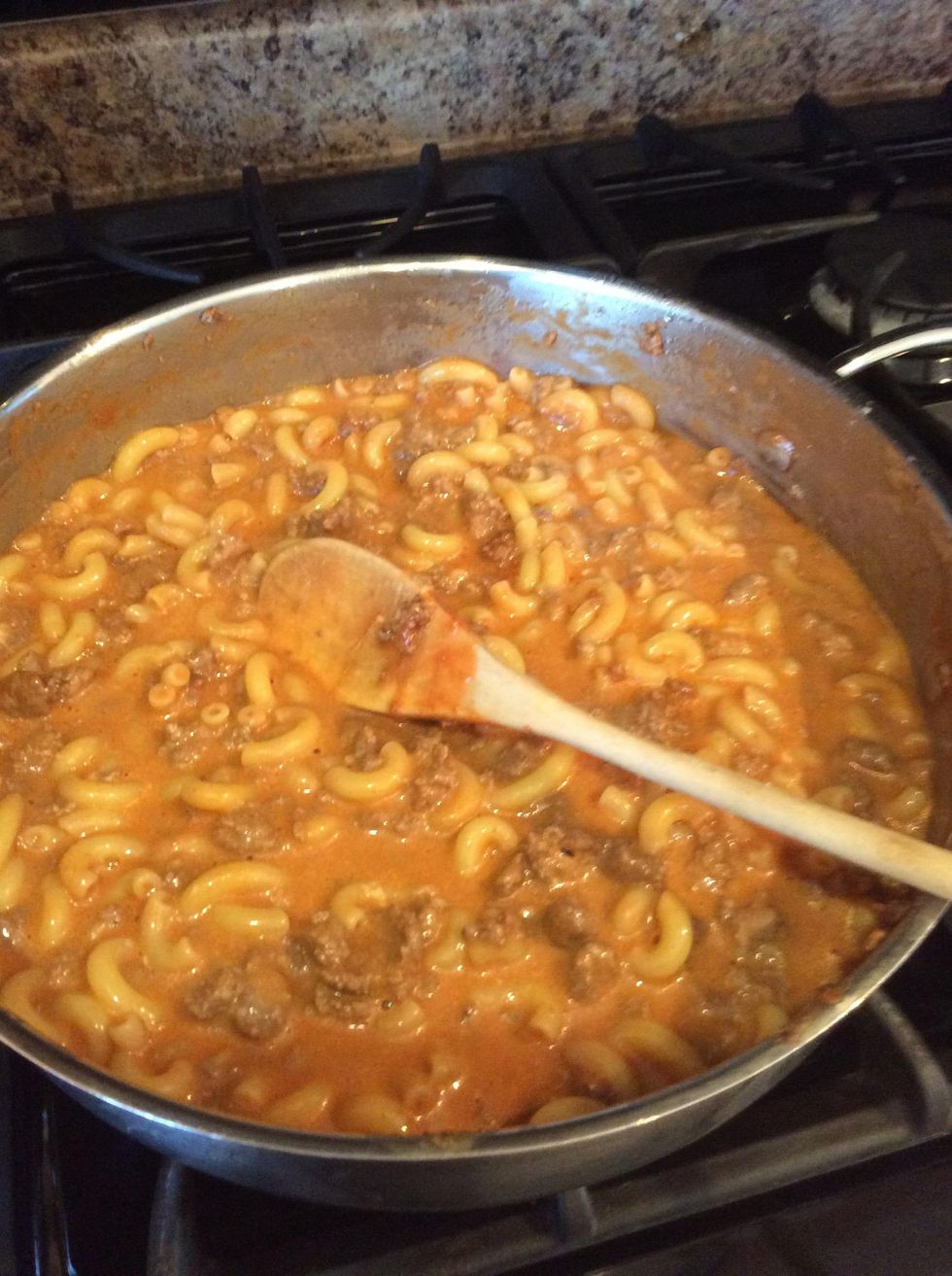 What you need: -1 lb of ground beef ,1 can of tomato soup ,6 slices of Kraft cheese, 3-4 large handfuls of noodles