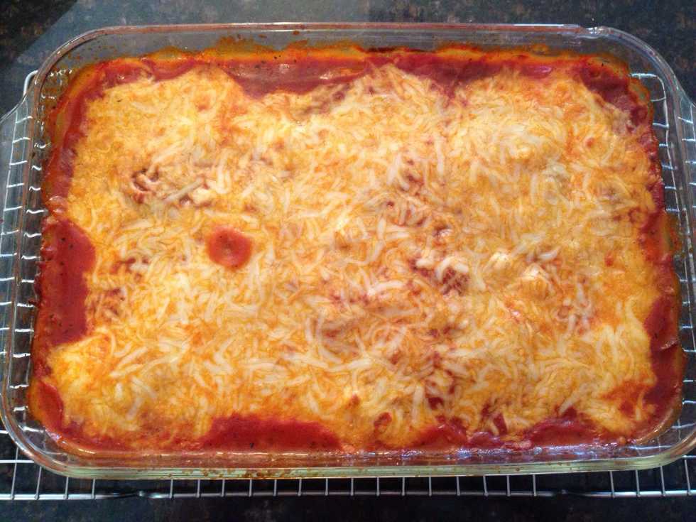 Repeat the last two steps (7/8) and your dish will be ready for the oven. Per heat oven to 350 degrees.