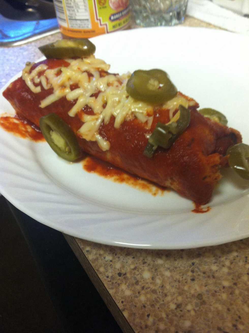 Put some enchilada sauce on the bottom of pan (prevents them from sticking) place your sexy rolled up enchiladas in the pan and pour the sauce on top. Top with cheese. Cover in foil, 20 min in oven.