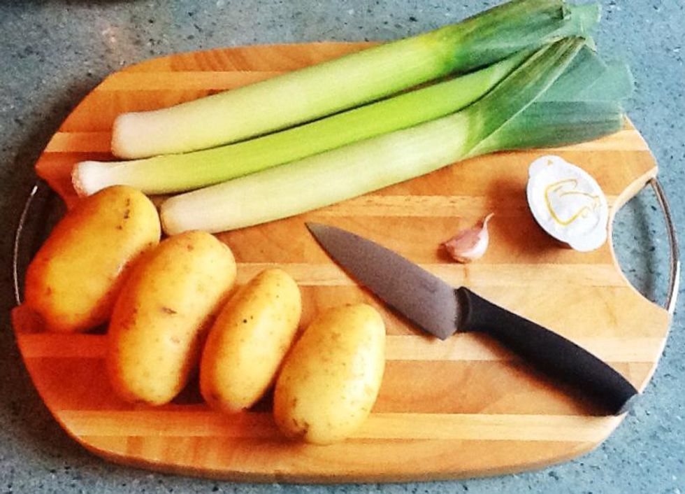 Add the stock and potatoes to your leeks, and simmer away gently for around 20mins or until the potatoes are soft.