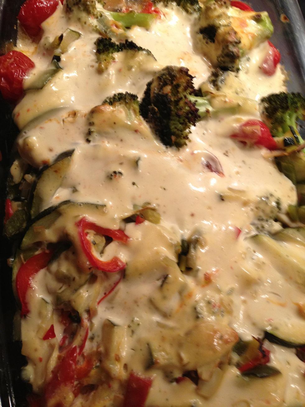 Put all the vegetables in a pan and stir in oil/butter for about 5-10 minutes. Meanwhile make the sauce, 1 can crème fraîche, wine, salt, pepper and french mustard. Stir and taste check > adjust.