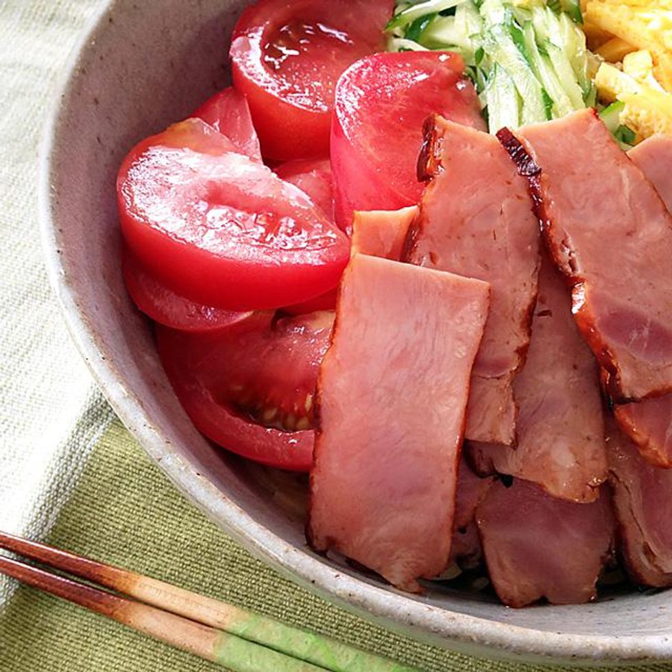 Popular toppings include, egg crepe strips, cucumber, ham, and bean sprouts.