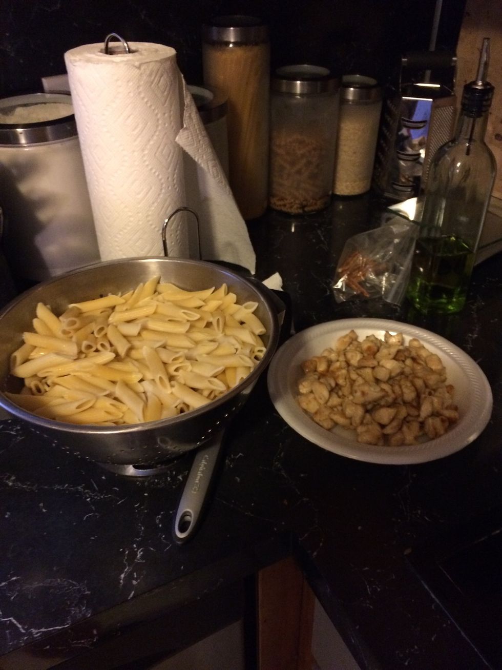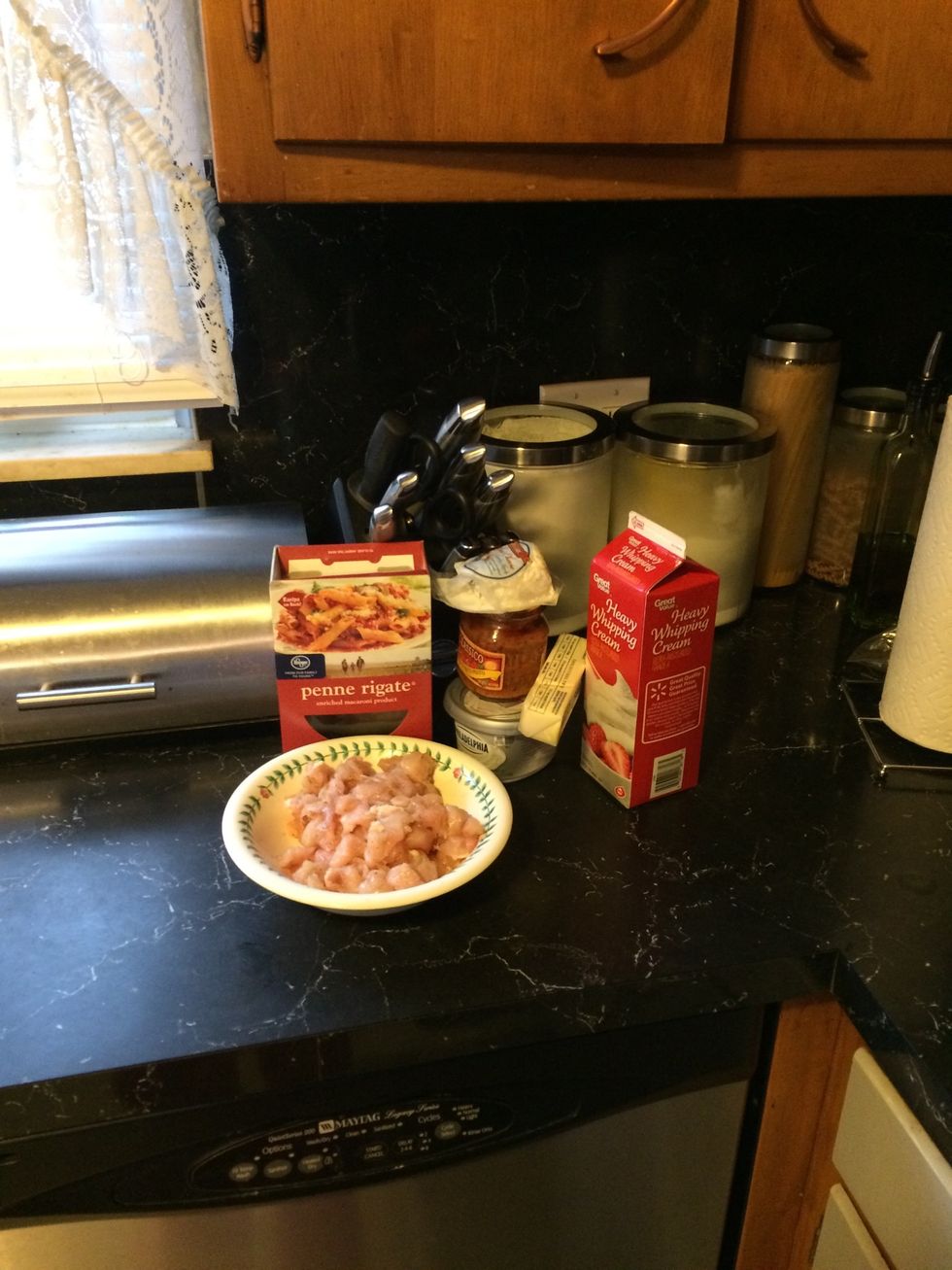 Cur chicken into cubes and season how ever you please.
