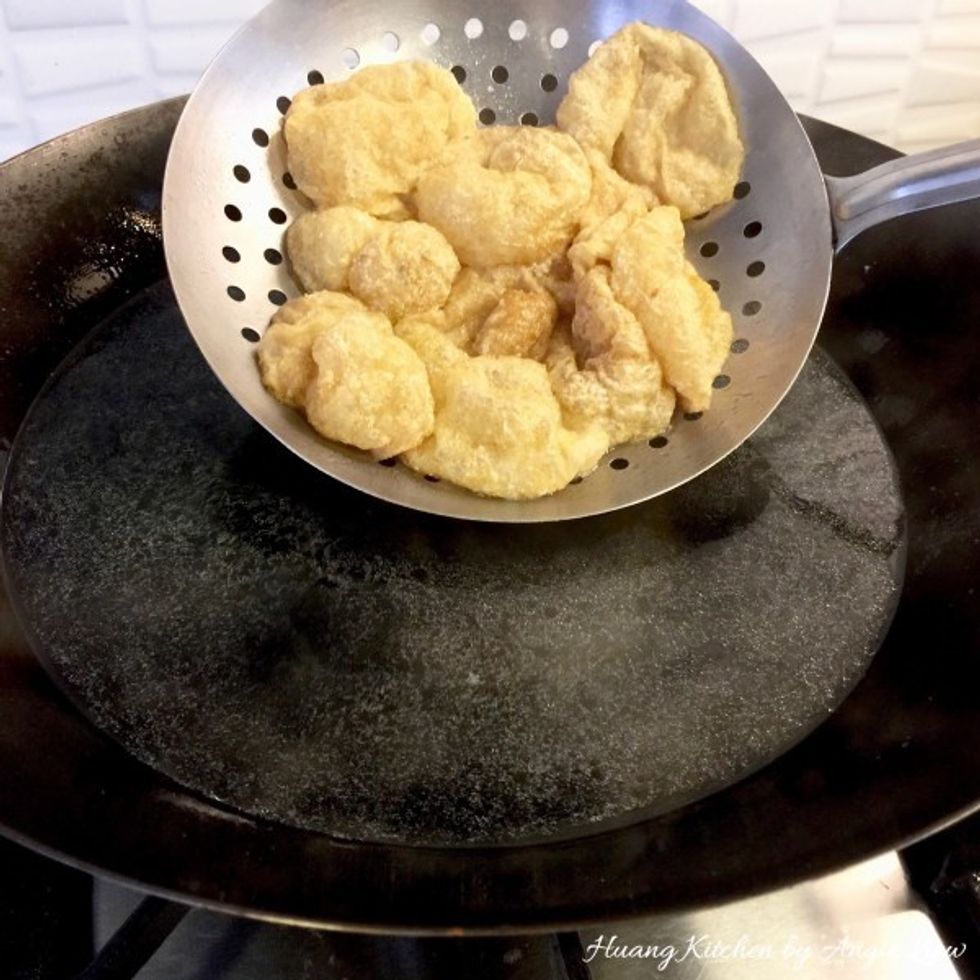 Then boil some water in a wok and briefly blanch the beancurd puffs in the hot boiling water to remove excess oil, about 3 minutes. Remove with strainer and drained well.