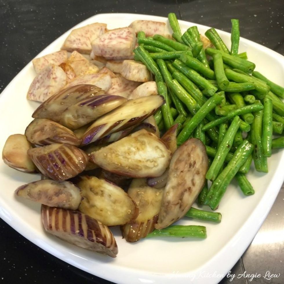 Next, add in the cooked brinjal, yam and long beans. Stir fry to combine everything together.
