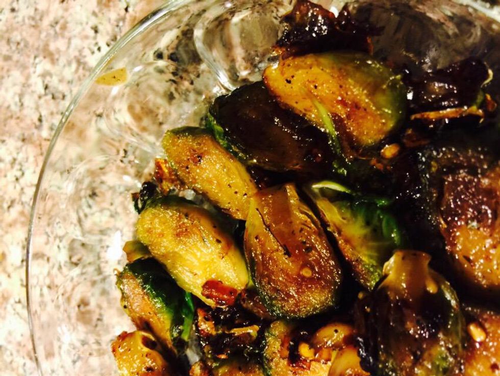 Add brussels sprouts. Season with salt, pepper, chilli flakes, oregano.