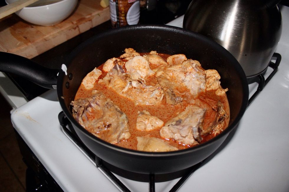 Cut chicken to pieces, boil for 5 minutes and set aside. Use some of left over water as broth.