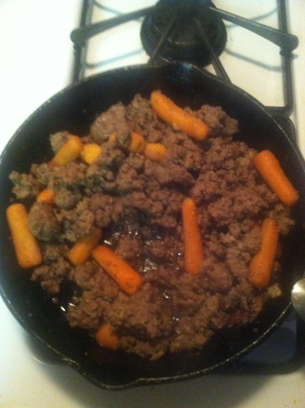 First we season & brown the ground beef and baby carrots in a shallow pan with Worcestershire sauce. Use the rest of these seasonings in the stew-(2nd step)