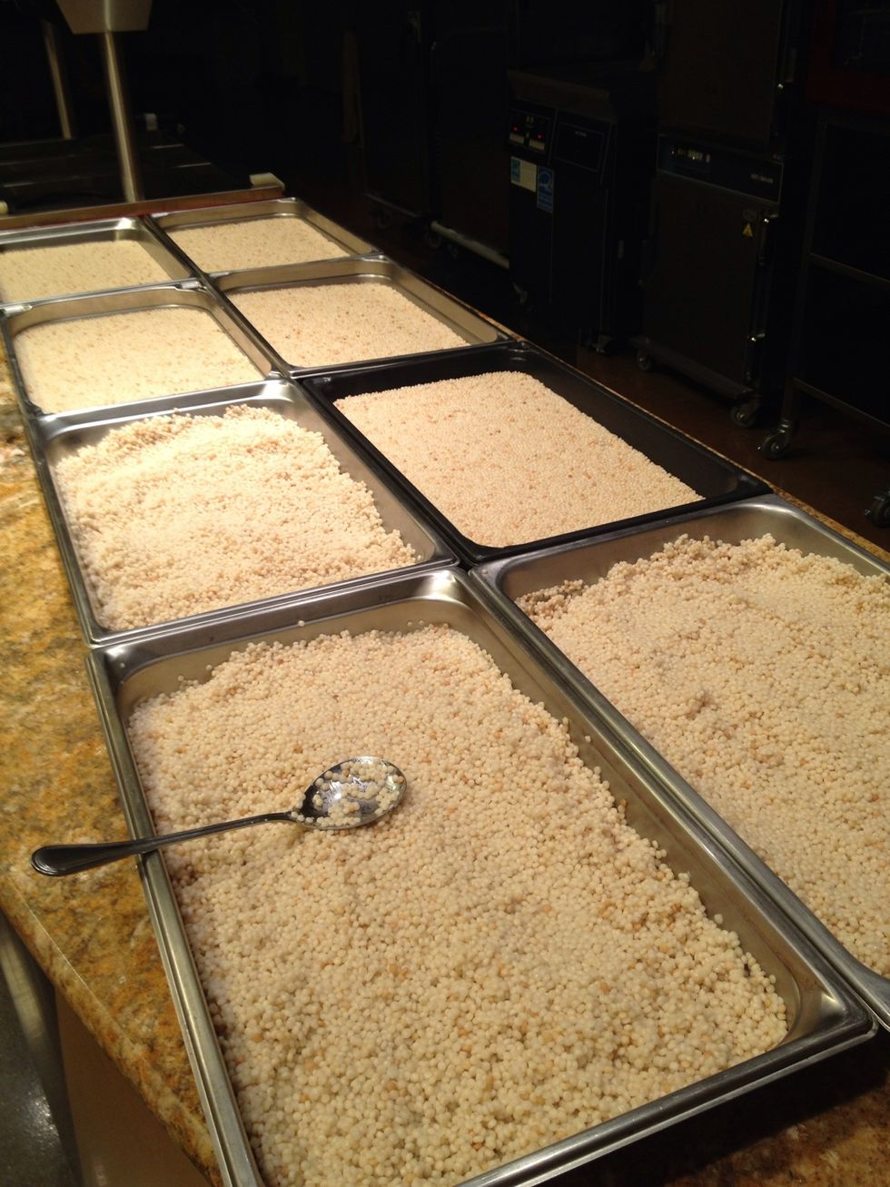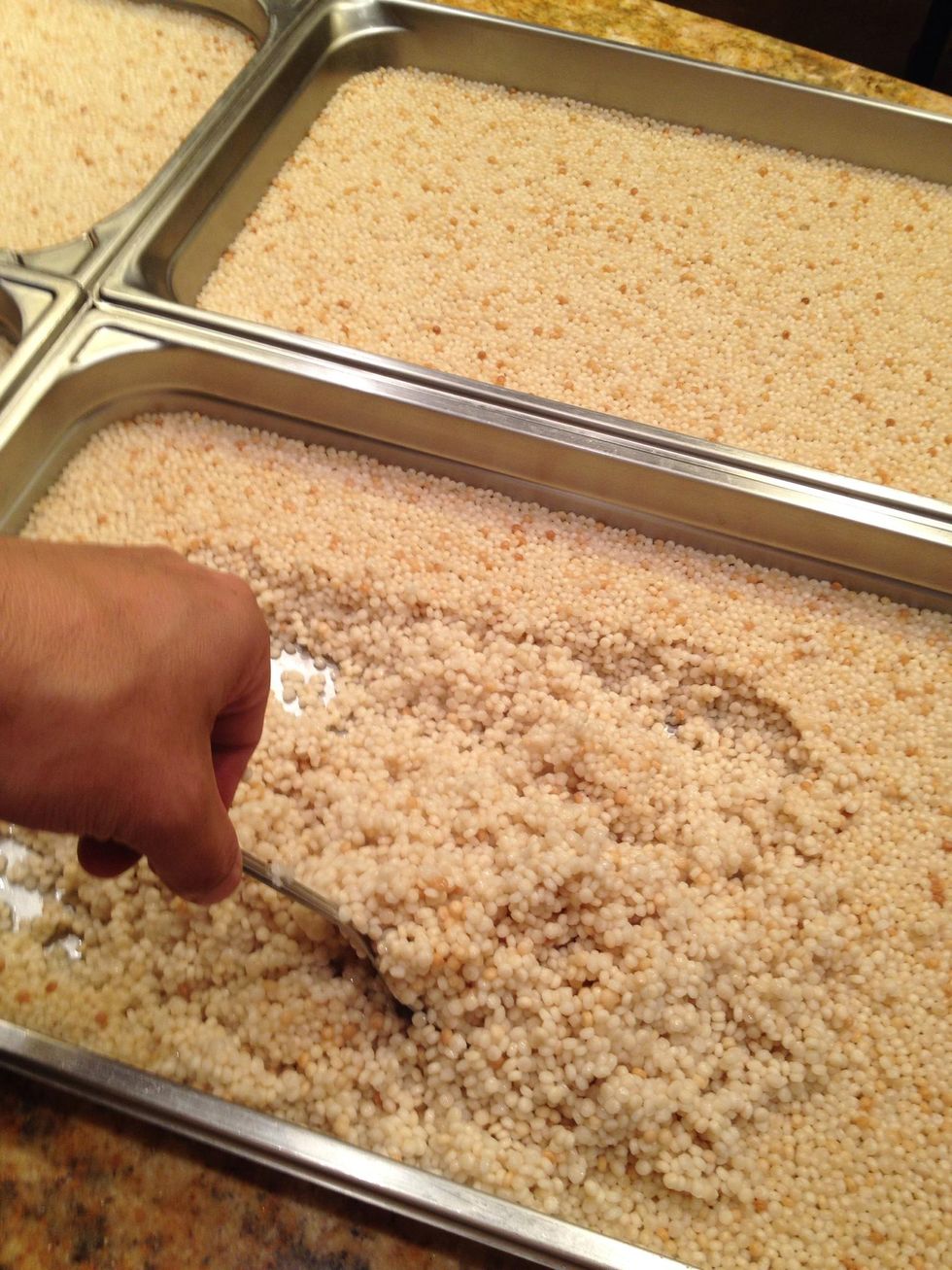 Upon removal, you will see a small amount of water remaining in the pan. Stir the cous cous and allow it to finish cooking and absorbing for a few minutes.