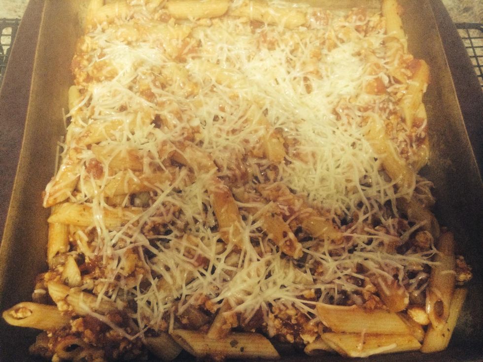 Spoon into pampered chef square stone baker. Sprinkle Parmesan cheese on top. Bake for 10 minutes on 350.