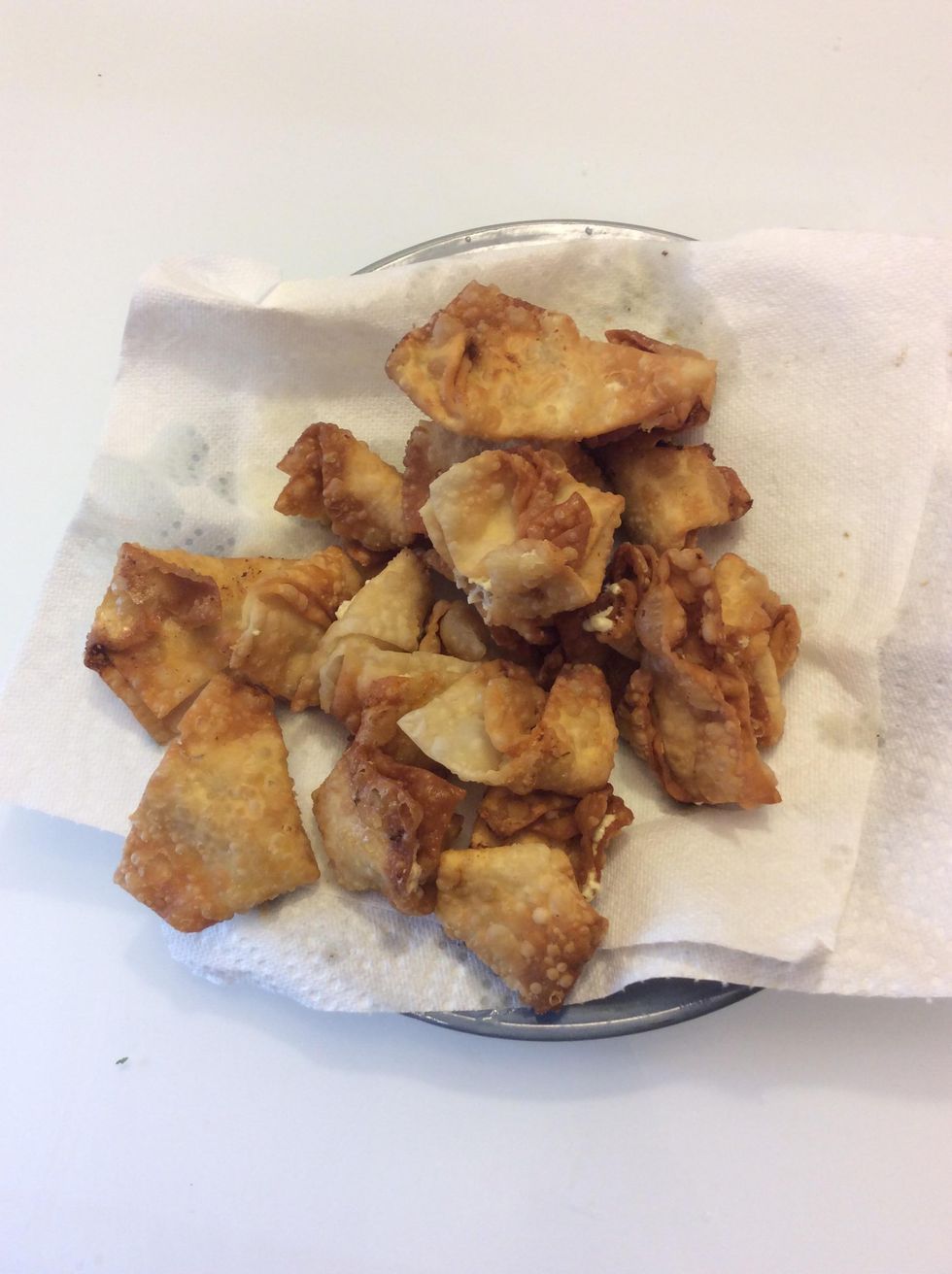Now get a spoon and plate,then won'ton wrappers on the plate. the mix on the, wrappers , don't use to much cream cheese