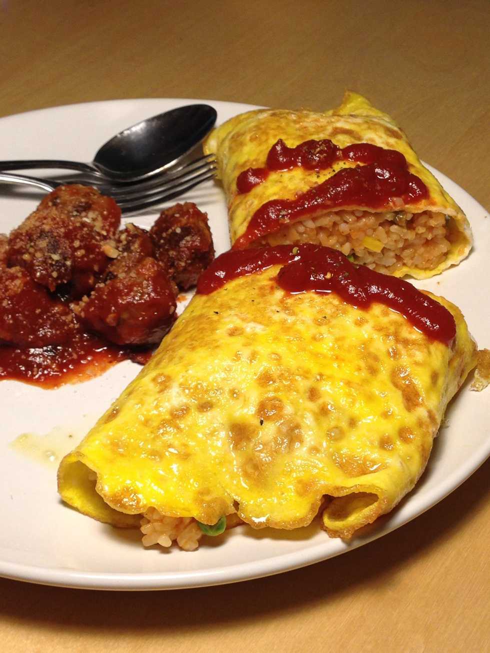 Fried the beaten eggs, set aside.Use another wok, fried mixed veggies.Add the rice.Add 2 tbsp of tomato sauce stir well with rice.Transfer some rice and ready to wrap.Put some more tomato sauce for garnishing. Done!