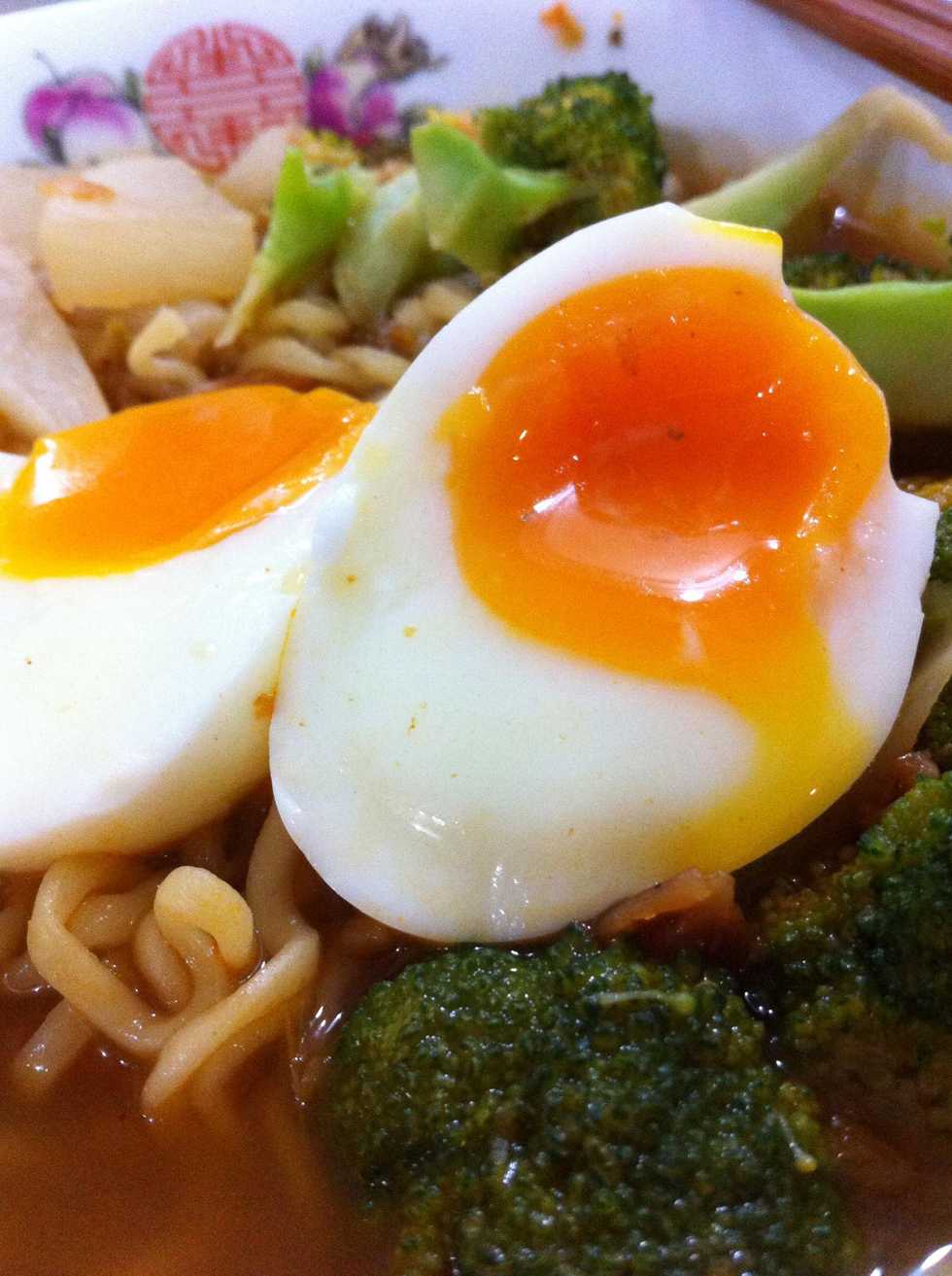 Prepare water just enough to cover the whole egg, and carefully put the egg into the water. Turn on the stove. Keep stiring the egg, to keep the egg yoke in the middle, until the water boil..