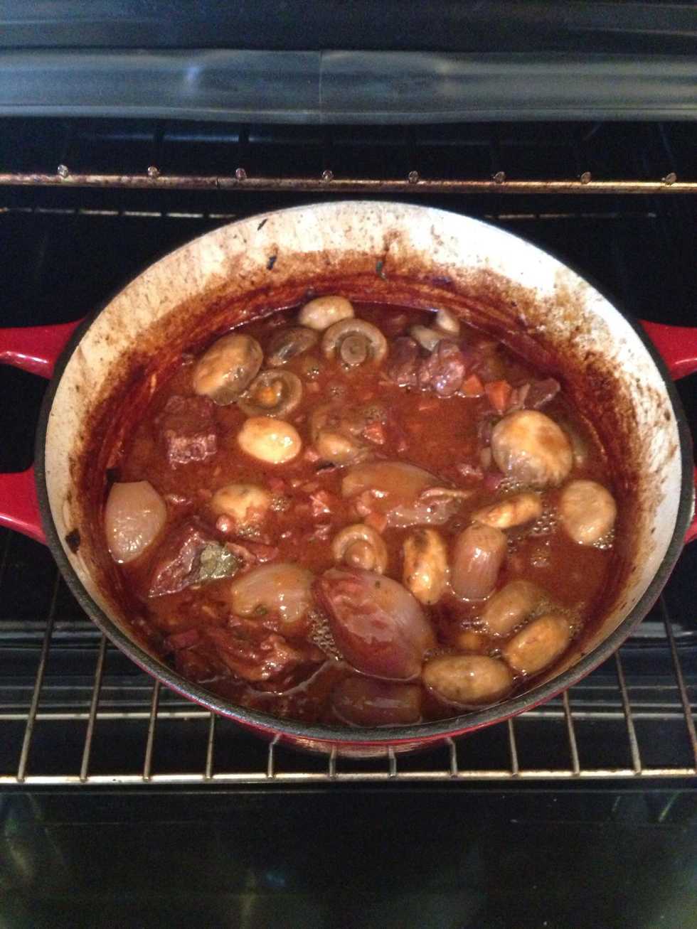 Add the vegetables, wine, beef stock, garlic, thyme, bay leaves and tomato paste and bring to boil on stove.