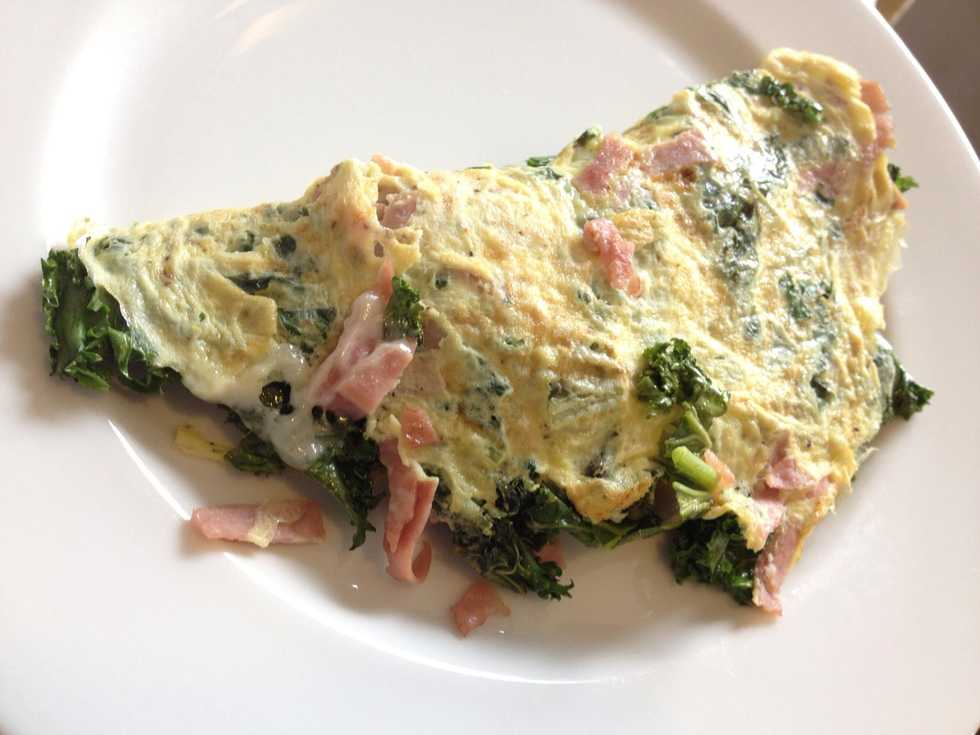 Pour the egg mixture onto the kale, stir a little, then add the cheese and ham. Cook until the egg starts to solidify and you can slide the omelet around in the pan. Don't let the eggs brown.