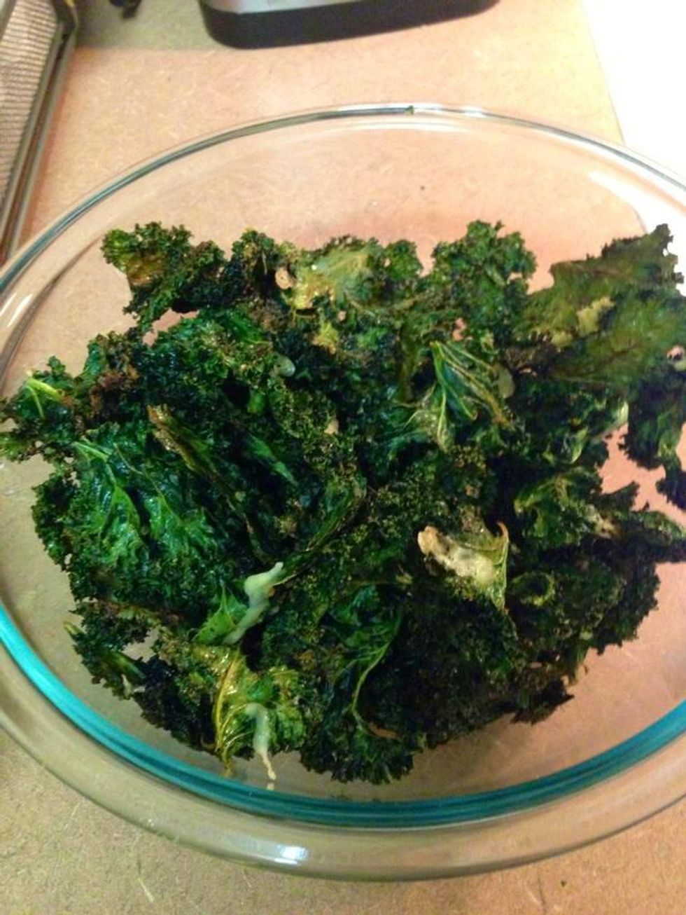 Once the kale has shrunken a bit and starts to slightly crisp (usually ~10 min), take out of the oven. Move the chips around a bit to loosen them up.