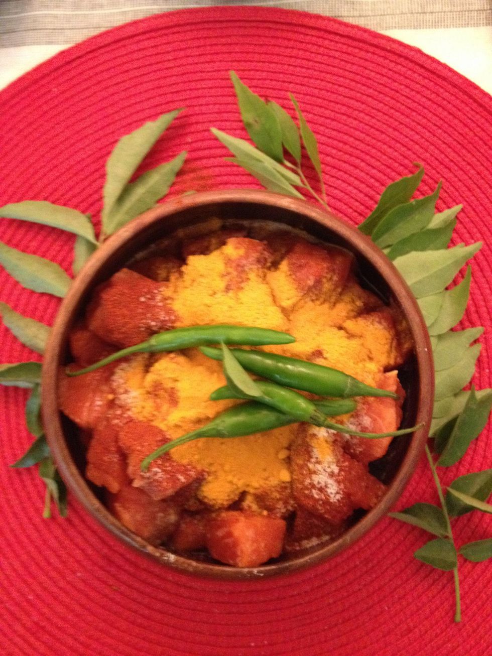 Marinate the fish cubes with vinegar , turmeric powder, salt and red Chilli powder for 30 minutes!!