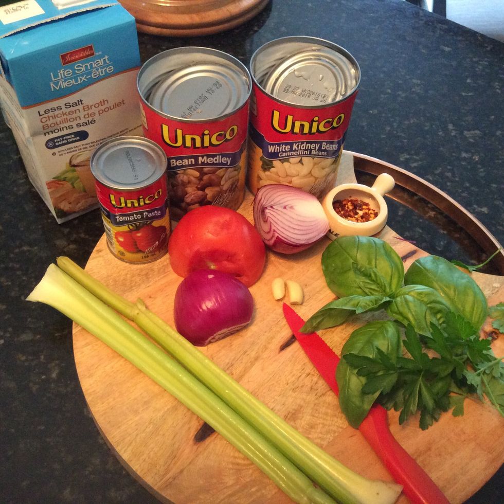 Cut all ingredients to bite size. Drain and rinse beans set aside. Sautée the veggies until soft. Add beans and then add chicken stock and wine. Add Tomato sauce and Chilis. Add all spices and herbs.