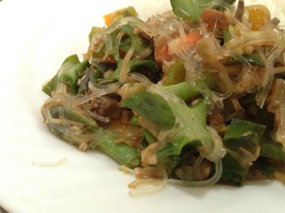 while sauteing the garlic and onion, let the bean or vermicelli noodles stretch in a pan of water. it should be soft by the time you are adding the vegetables. mix in after all the vegetables.