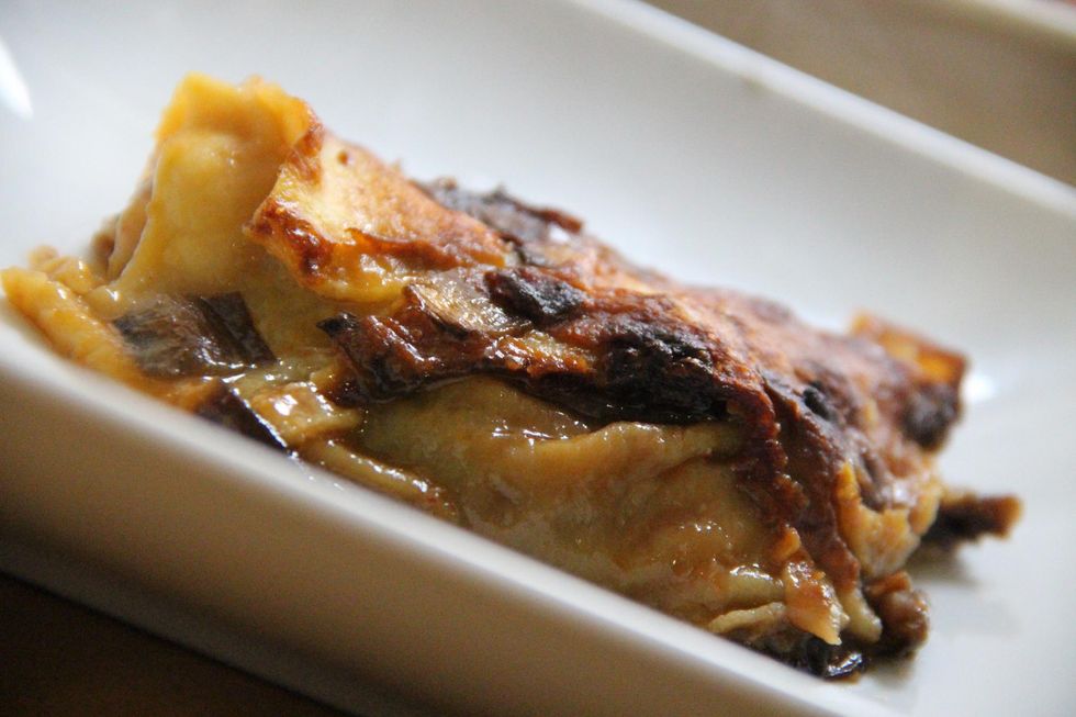 Take your lasagna pan and start with a first layer of bisque and radicchio