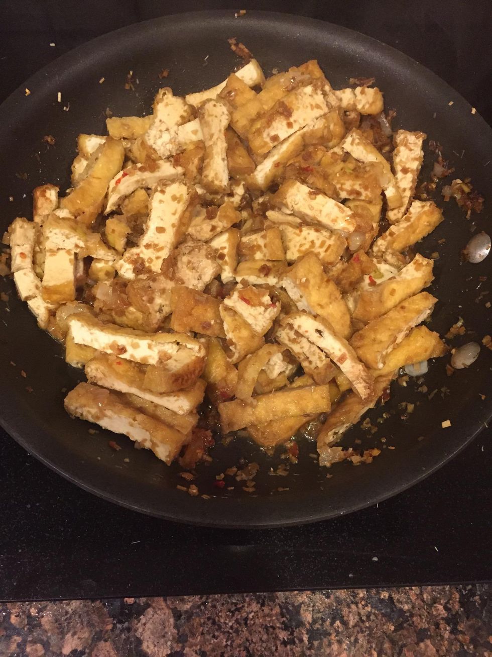 Buy fried tofu (or fry your own but it's messy!) and slice into 1/4 inch slivers