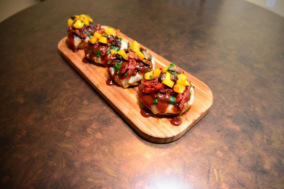 I added cheese and some more sun-dried tomatoes (addicted)!! Drizzled barbecue over them before taking them out the pan, and added my awesome toppings!