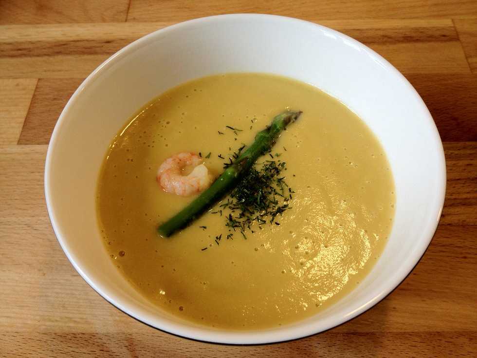 龍蝦膏一罐把洋蔥一顆、蒜頭二瓣切一切,用奶油拌炒。 加入切好的馬鈴薯、冰箱中的菜,還有整罐龍蝦膏,想加料的話可以再放一些去殻蝦仁,煮到水滾後,離火放涼。全部一起丟到果汁機打。湯已經可以上桌了。想好看一奌的話,再加入一奌綠色蔬菜、紅色蝦仁再煮到滾。這時可以依照口味加水調整濃淡。上桌啦!