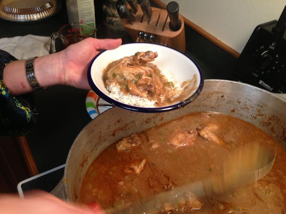 Add 1 and 1/2 quarts of chicken broth and simmer for 15 minutes. Add 1 cup water if needed for the roux to achieve a thick slurry