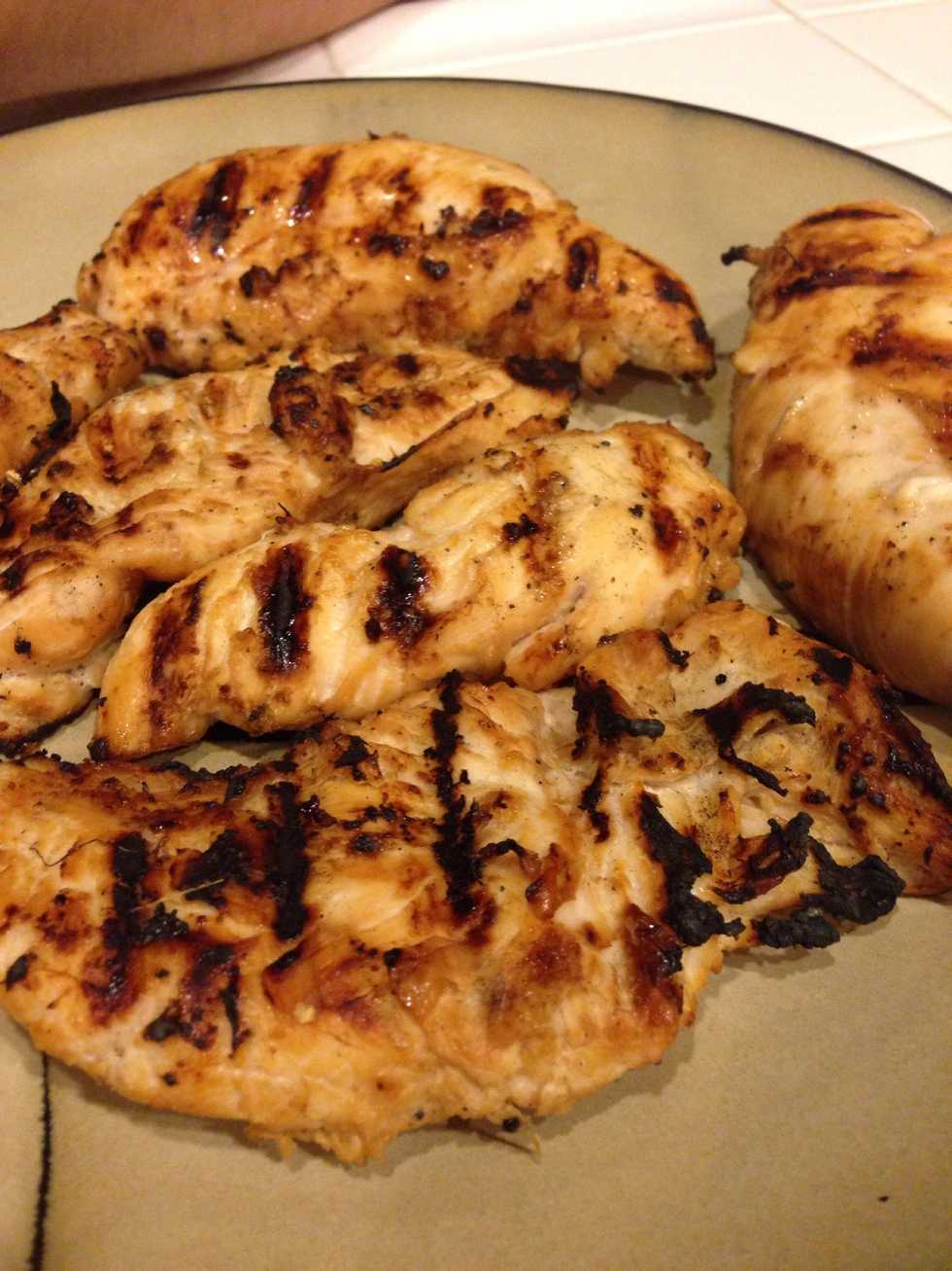 Grill chicken for about 10 minutes or until the internal temp reaches 160 degrees. You should get some great grill marks from the marinade.
