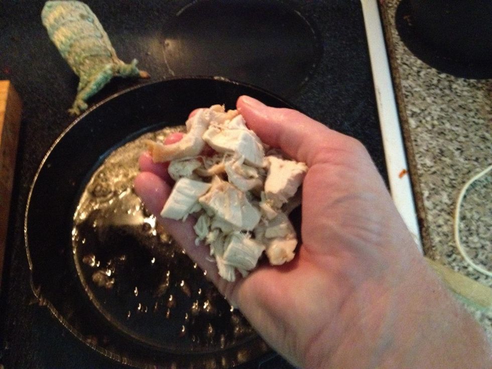 Add a handful of pre-cooked chicken. This was just some leftover chicken I found in the fridge that I hoped my wife didn't have plans for it. If the chunks are too big, chop them with your spatula.