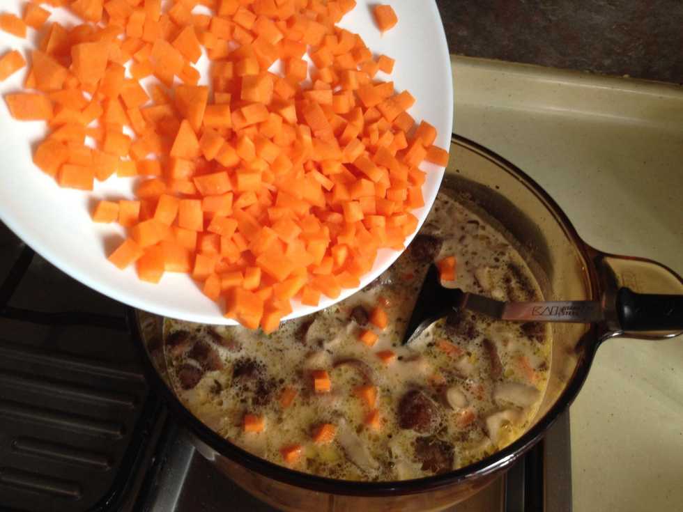 Add butter. Add garlic, onions to stir fry. Next, add chicken. Followed by mushrooms. I added some parsley and oregano flakes.