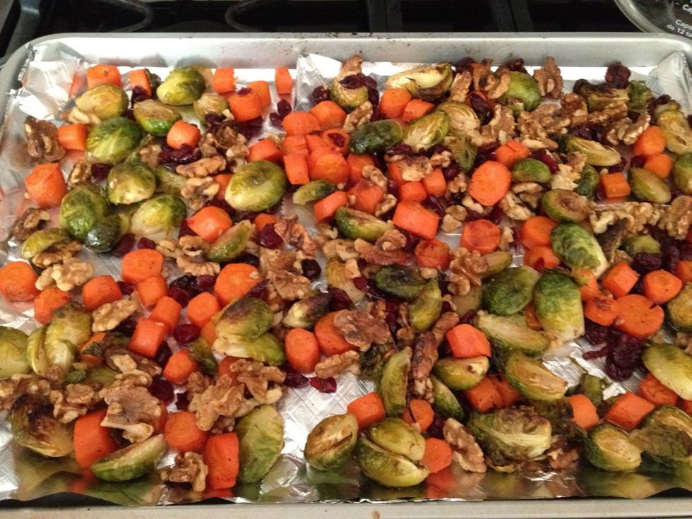 Place on middle rack in oven and roast for 25 min. Remove from oven, stir and then add walnuts and dried cherries evenly over the vegetables. Return to oven and roast for another 15 minutes.