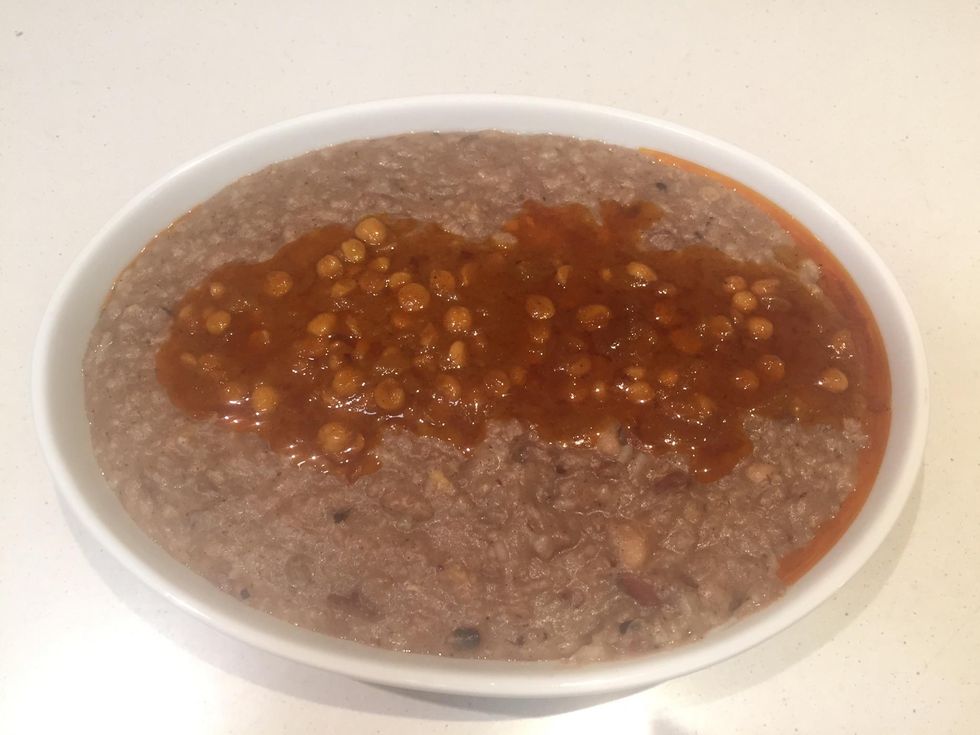 Cook all beans, rice and wheat and mix them together. Add two cups of water and cook them together until all soften and mashed.