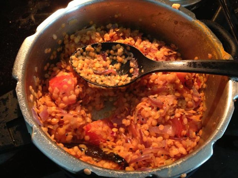 Cut one tomato into chunks and add it to the pressure cooker with the onions.