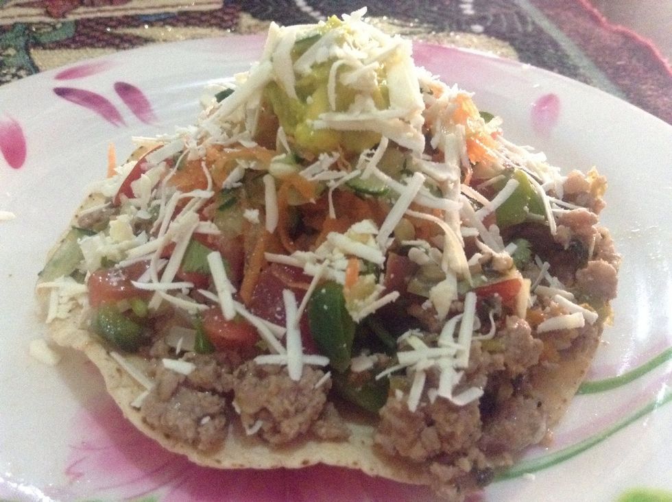 Put the toasted tortilla, a bit of avocado, meat, toppings and the cheese. ENJOY!