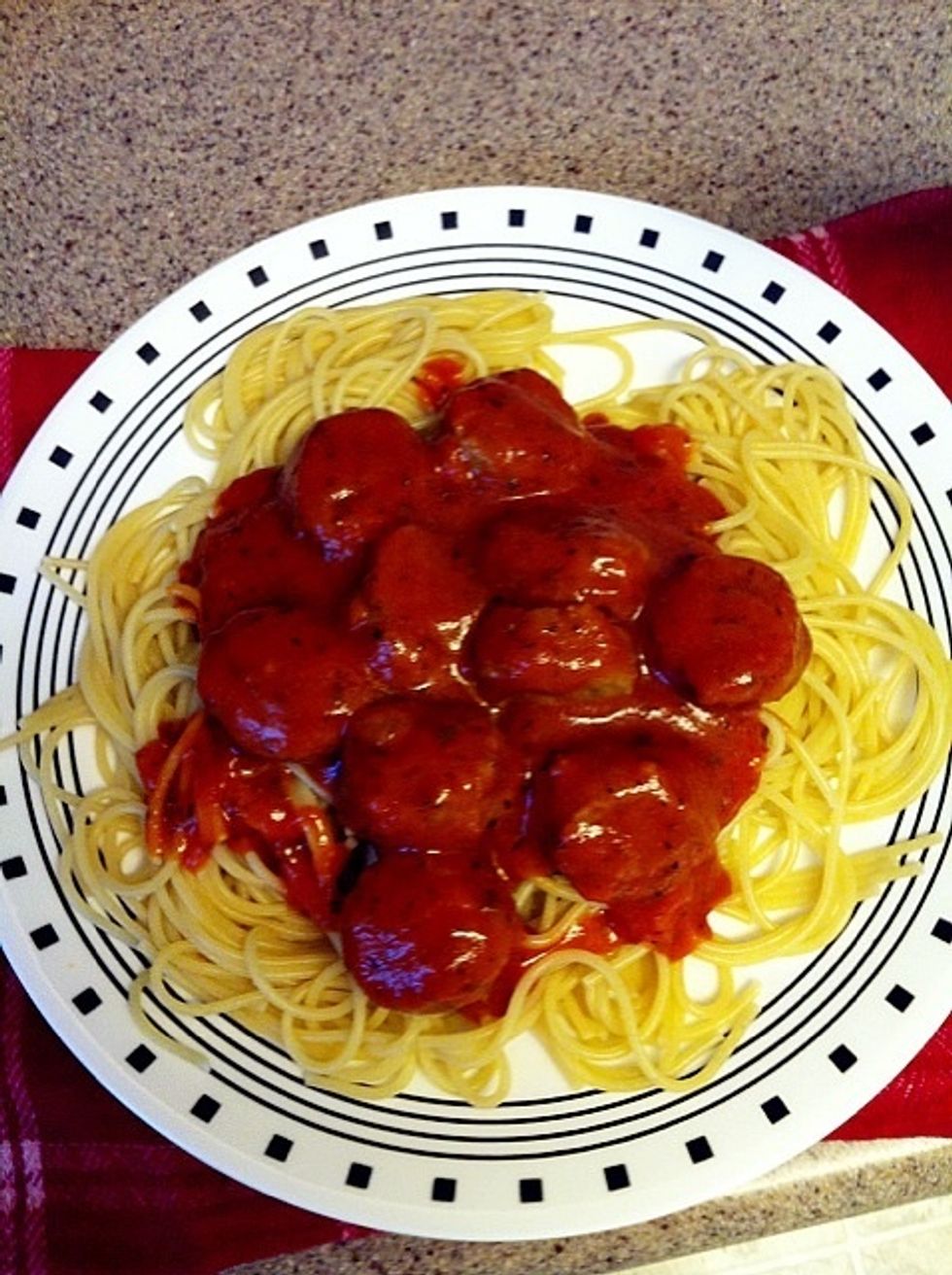 Put the meatballs on top of spaghetti. Serve in hot and ready to eat! Enjoy~