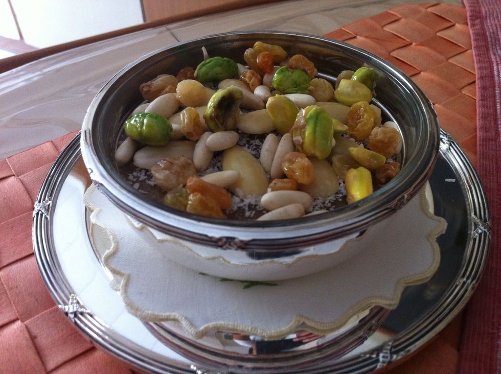 Dip the pine nuts, almonds, pistacchio and raisins in water and keep refrigerated for 24 hours. They will be used, at the end, for decoration.