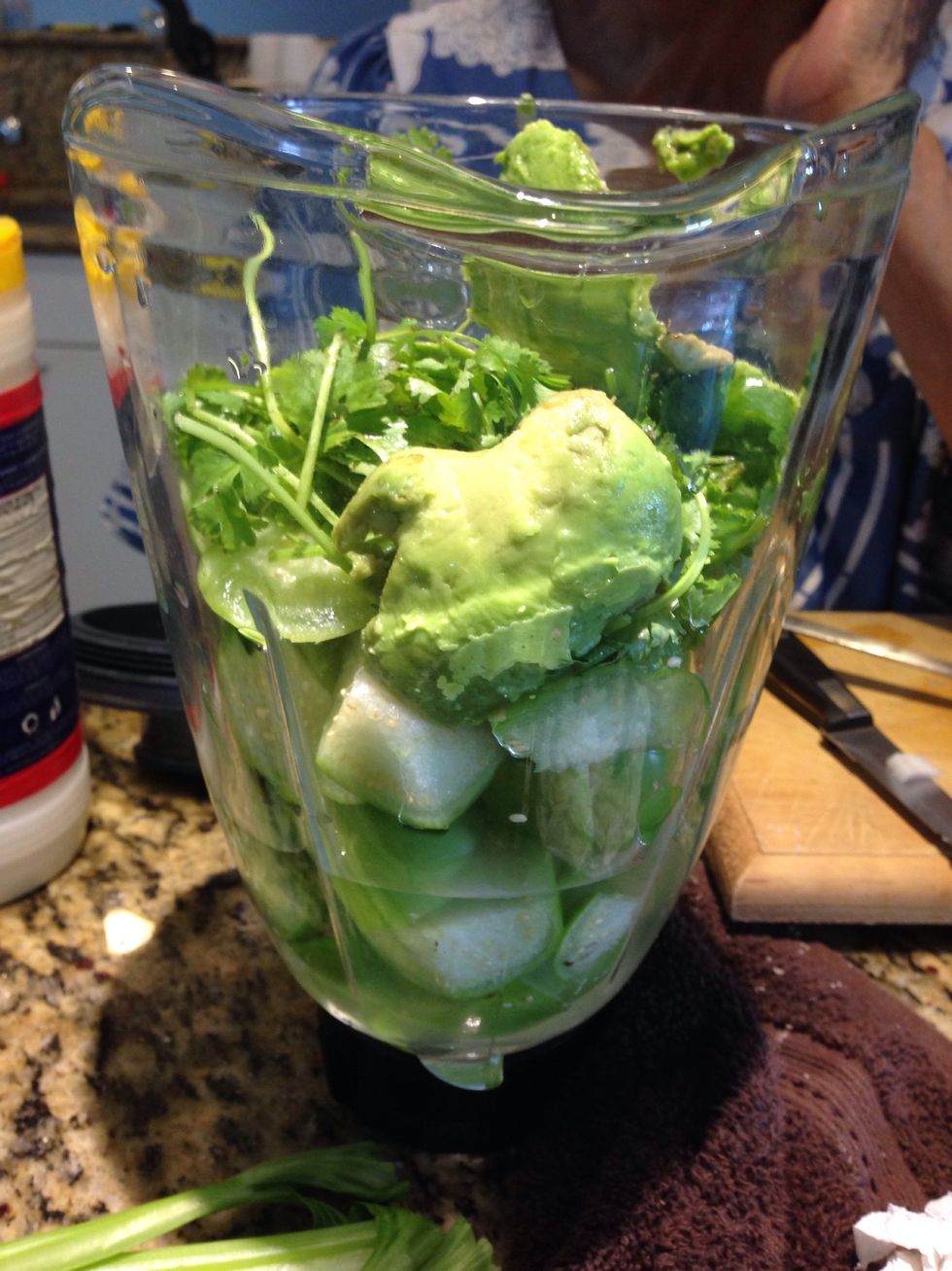Para hacer la Salsa!! Se ponen picados los tomates, el pedazo de cebolla, los aguacates, el cilantro, el ajo y la sal y se licúa.