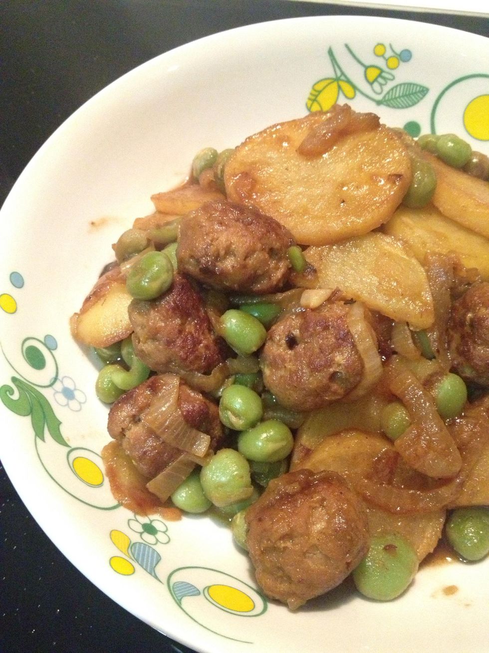 Add in the cooked pork balls and potatoes.