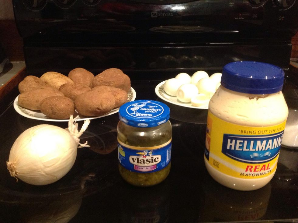 Ingredients: cooked potatoes, eggs, onion, sweet pickle relish, hellmann's mayonnaise