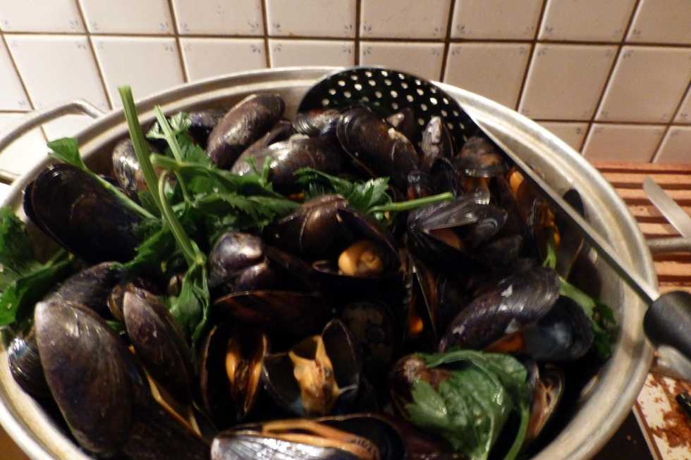 Cook the mussels in a pot with celery, onions, a little salt and pepper and white wine or beer.
