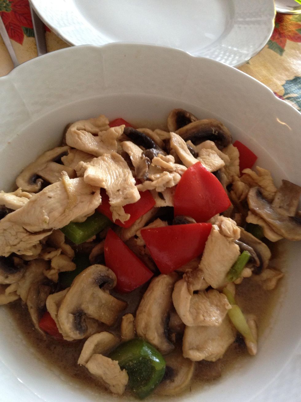 Warm the pan,put oil over the bottom,with medium heat fry the ginger and green onion for 5sec,then put the chicken in,till the chicken turn to white