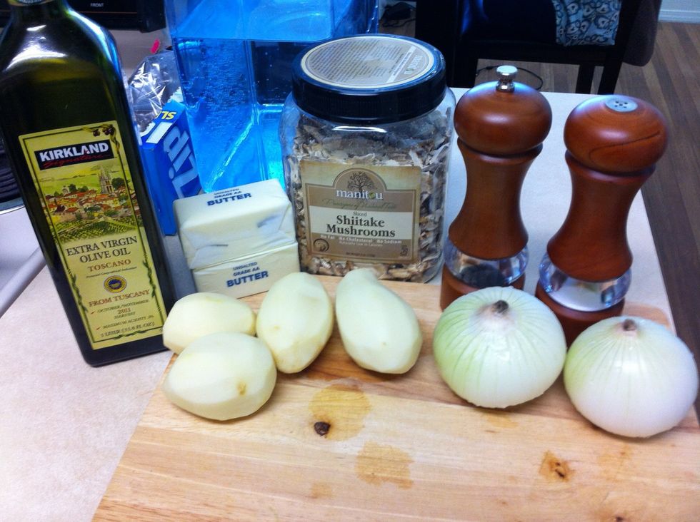 chop the potatoes and put in a pot with water. cooking. chop the onion.melt the butter and add the olive oil.