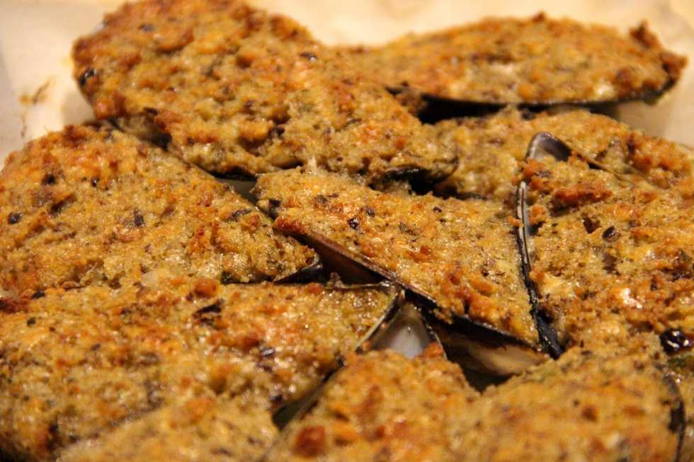 Now you have your breadcrumbs, parmesan cheese and the water from the mussels